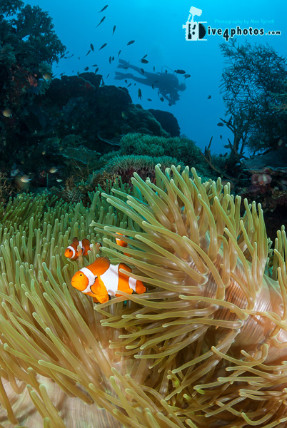 Tomato Anemonefish with Diver (Amphiprion frenatus)