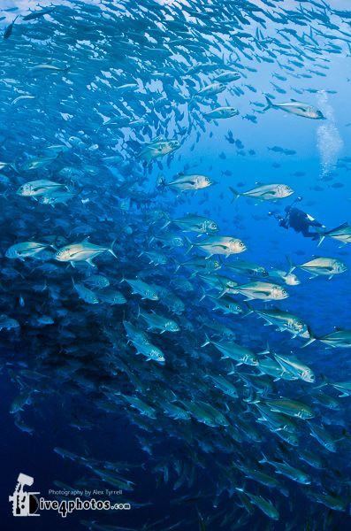 Bigeye Trevally School & Diver (Caranx sexfasciatus)